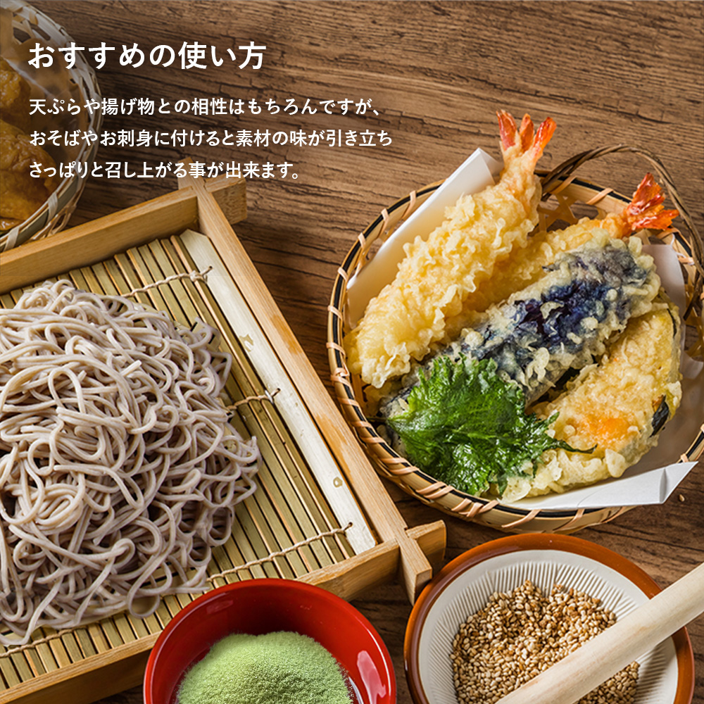 抹茶塩 小袋 原材料:食塩(国内製造),抹茶/調味料(アミノ酸) 規格:1g(1g×100) 製造地(包装地):大阪府八尾市 賞味期限:製造日+450日 アルミ袋100g 原材料:食塩(国内製造),抹茶/調味料(アミノ酸) 規格:100g(チャック付きアルミ袋) 製造地(包装地):大阪府八尾市 賞味期限:製造日+450日 アルミ袋1kg 原材料:食塩(国内製造),抹茶/調味料(アミノ酸) 規格:1kg(チャック付きアルミ袋) 製造地(包装地):大阪府八尾市 賞味期限:製造日+450日 抹茶塩について抹茶で有名な愛知県西尾産の抹茶を、赤穂産のお塩とブレンドしたこだわりのお塩です。 抹茶はきめが細かく、くちどけ良くなり口に入れた瞬間に爽やかな香りと塩の旨味が広がります。天ぷらなどの揚げ物と相性は抜群です。 抹茶塩 原材料:食塩(国内製造),抹茶/調味料(アミノ酸) 内容量:100g(1g×100) / 100g(チャック付アルミ袋) / 1kg(チャック付アルミ袋) 賞味期限:製造日より450日 抹茶で有名な愛知県西尾産の抹茶を石臼で挽き、赤穂産のお塩とブレンドしたこだわりのお塩です。 石臼で挽いた抹茶はきめが細かく、くちどけ良くなり口に入れた瞬間に爽やかな香りと塩の旨味が広がります。 天ぷらなどの揚げ物と相性は抜群です。 ご購入はこちら ご購入はこちら